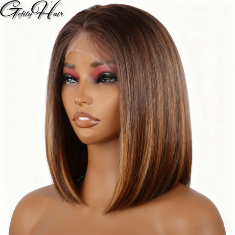 Gefily 10‘’ 13x4 4/27 Highlight Brown Blonde Straight Bob Wig – Transparent Lace, 100% Human Hair, Effortless Natural Look