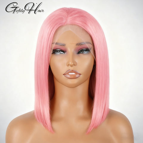 Gefily 10” 13x4 Pink Straight Bob Wig – HD Lace, 100% Human Hair,Cosplay Colorful Style