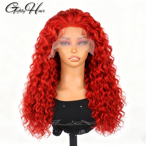 Gefily 20‘’-36‘’ 13x4 Fire Red Lace Front Wig Curly Wave Deep Wave– Bold Color, Super Invisible Lace, 100% Human Hair, Vibrant Red Shade