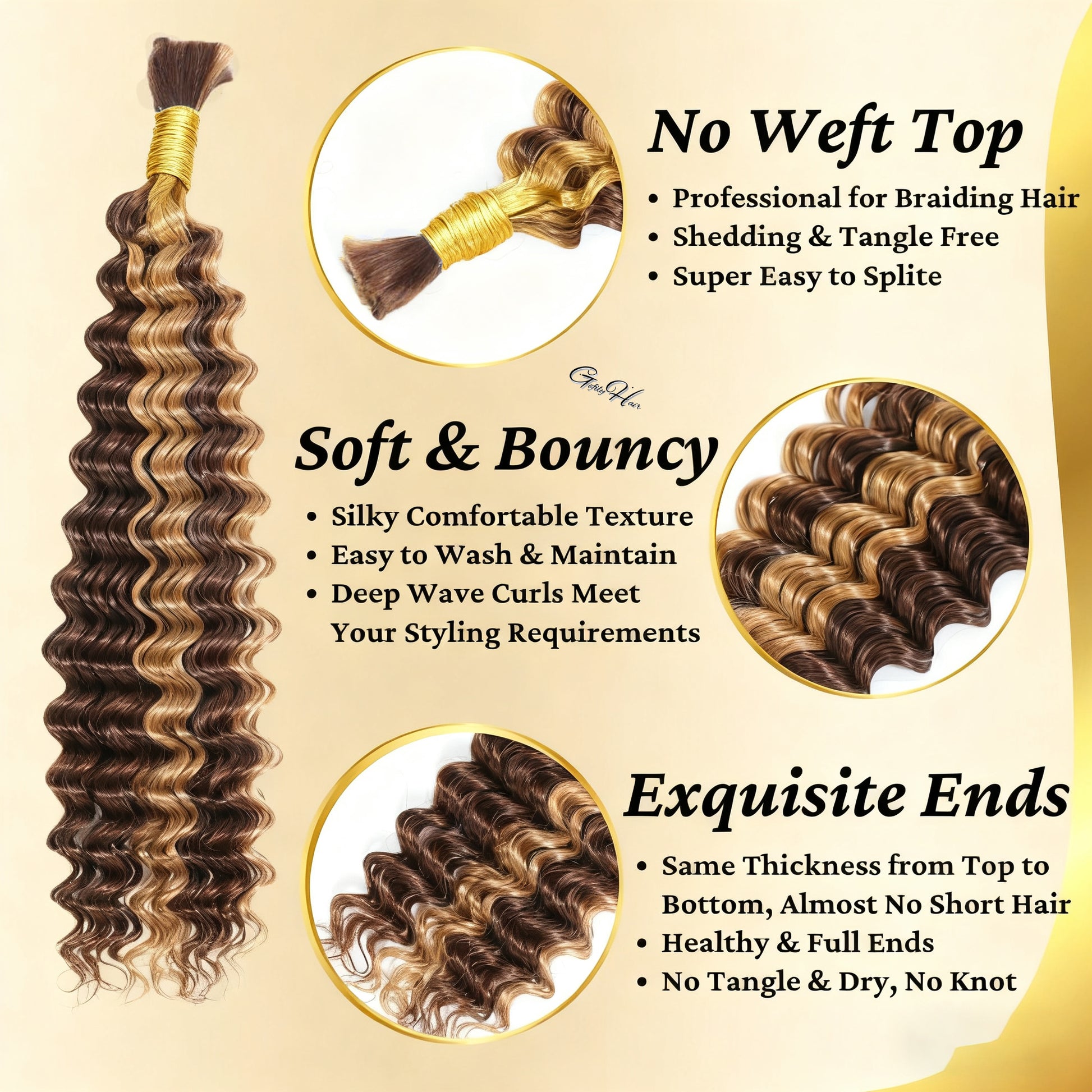 Gefily 16’’–26’’ Braiding Hair #4/27 Highlight Brown Deep Curly Wave Hair – 100% Virgin Human Hair, Soft & Full